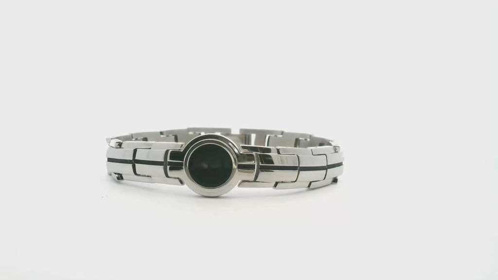 Elevate your style with the Midnight Headdress Roundel Bracelet, a stunning piece crafted from hypoallergenic stainless steel. This men's bracelet features a polished silver finish and an etched onyx centerpiece showcasing the iconic Indian Motorcycle headdress logo. The fold-over clasp ensures a secure and comfortable fit. Perfect for everyday wear or special occasions, this bracelet combines rugged durability with refined elegance.