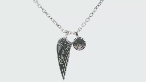 View full detailsEmbody the spirit of the open road with the Midnight Rectangle Indian Motorcycle Script Necklace. This sleek rectangular pendant features a black o...